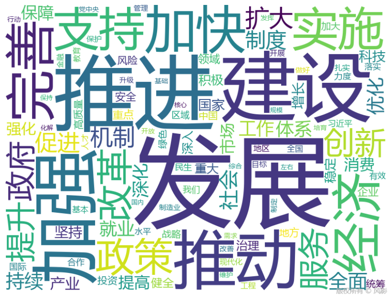 由统计分析可知,《政府工作报告》通过高频词如“发展”“推进”“建设”“加强”“推动”等,凸显了2025年中国政府工作以高质量发展为核心,强调通过深化改革、科技创新、制度完善和政策支持,加快构建现代化产业体系,扩大内需,推进城乡区域协调发展,强化生态保护和社会民生保障,统筹发展和安全,以实现经济持续回升向好、社会和谐稳定及“十四五”规划目标的圆满收官,为中国式现代化注入强劲动力。