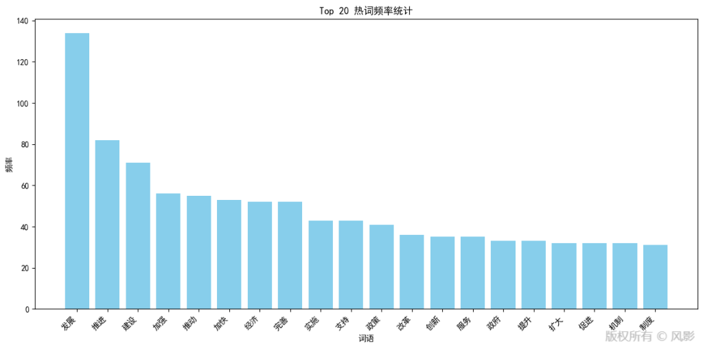 热词频率统计的核心流程包括:读取文本、进行中文分词,并对分词结果进行词频统计。在中文处理中,由于文本没有明显的词界分隔符,因此我借助 jieba 分词工具对原始语句进行切分,得到有意义的词语列表。随后,利用 collections.Counter 对词语出现次数进行计数,并筛选出高频热词,从而揭示报告的主要关注点与主题内容,最终可以将热频词可视化为直方图。