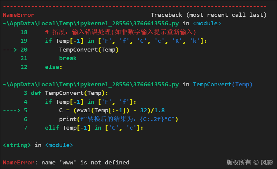由上述代码,通过切片来判断输入的合法性以及进行转换,对于输入错误处理,我建立了一个死循环,并也以切片判断合法性,经过测试后,存在的问题是当我输入类似”wwwF”、“中文K”,这些非法数据会报错,如下所示。