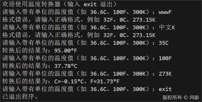 print("欢迎使用温度转换器(输入 exit 退出)")