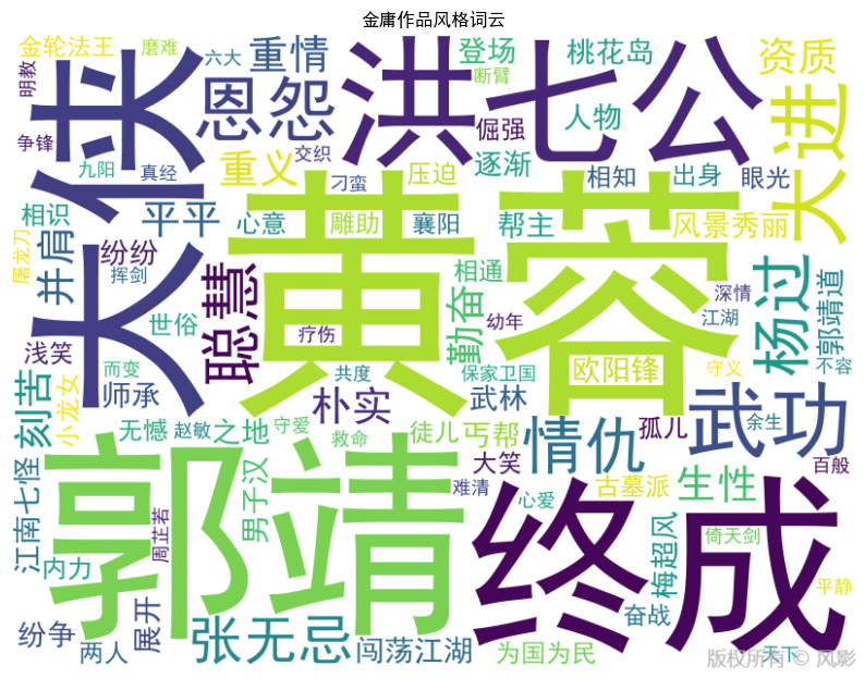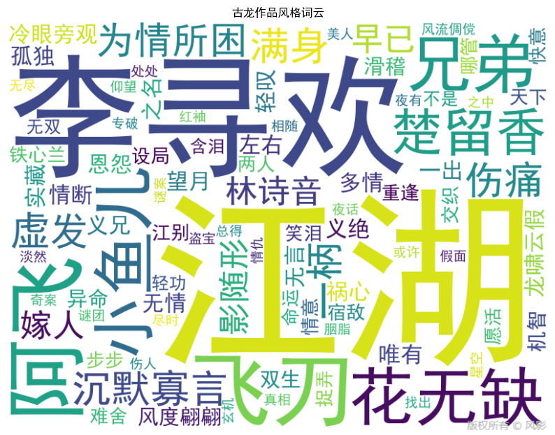 我通过摘录金庸(古龙)作品的精彩片段,然后提取高频词以总结风格,最终绘制词云图,代码如下: