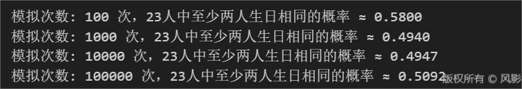 1.基础:生日悖论分析。如果一个房间有23人或以上,那么至少有两个人的生日相同的概率大于50%。编写程序,输出在不同随机样本数量下,23个人中至少两个人生日相同的概率。