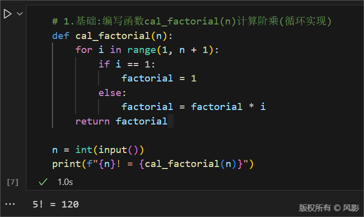 1.基础:编写函数cal_factorial(n)计算阶乘(循环实现)。
