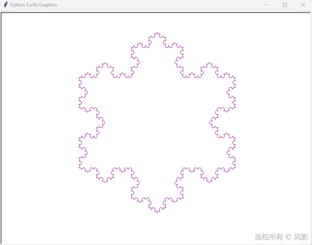 任务三要求为科赫曲线正向、反向绘制,加入绘制速度、绘制颜色等额外功能,科赫曲线是一种经典的分形图形,通过将线段不断等分并在中间插入等边三角形的方式递归生成。科赫曲线的经典拓展形式就是 科赫雪花(Koch Snowflake),代码如下: