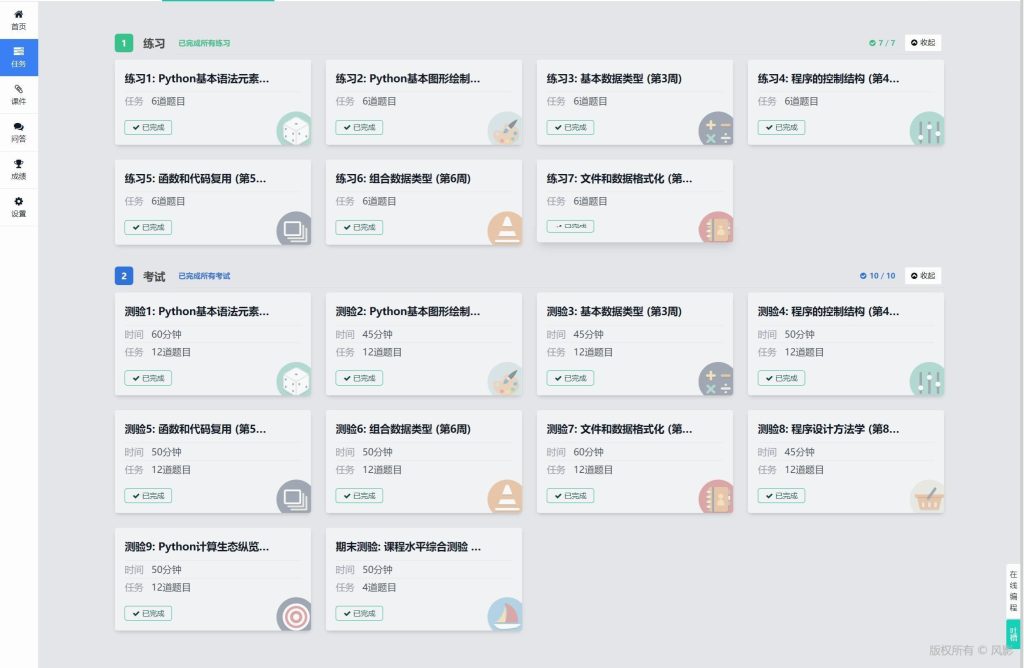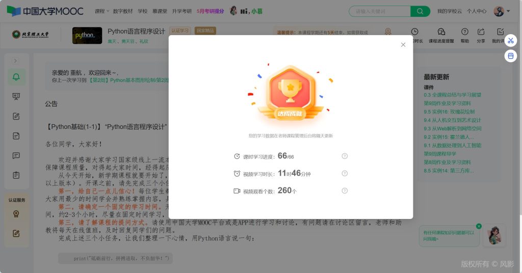 Python大学MOOC课程结课证明 2025-5-20 11:05 | Python,日常学习 | 19 | 0 39 字 | 几秒读完 本文最后更新于209 天前,如有错误请发送邮件到yaoshengliy@gmail.com 证明截图 以下是我在大学MOOC网上学习Python语言程序设计的界面以及学习完成截图。 原文作者:© 风影 版权所有 原文链接:https://sily.showbyte.top/mooc/ 本作品采用 CC BY-NC-ND 4.0 许可协议。禁止修改原文内容,引用时务必注明文章标题、原文链接及作者信息 #Python日常学习